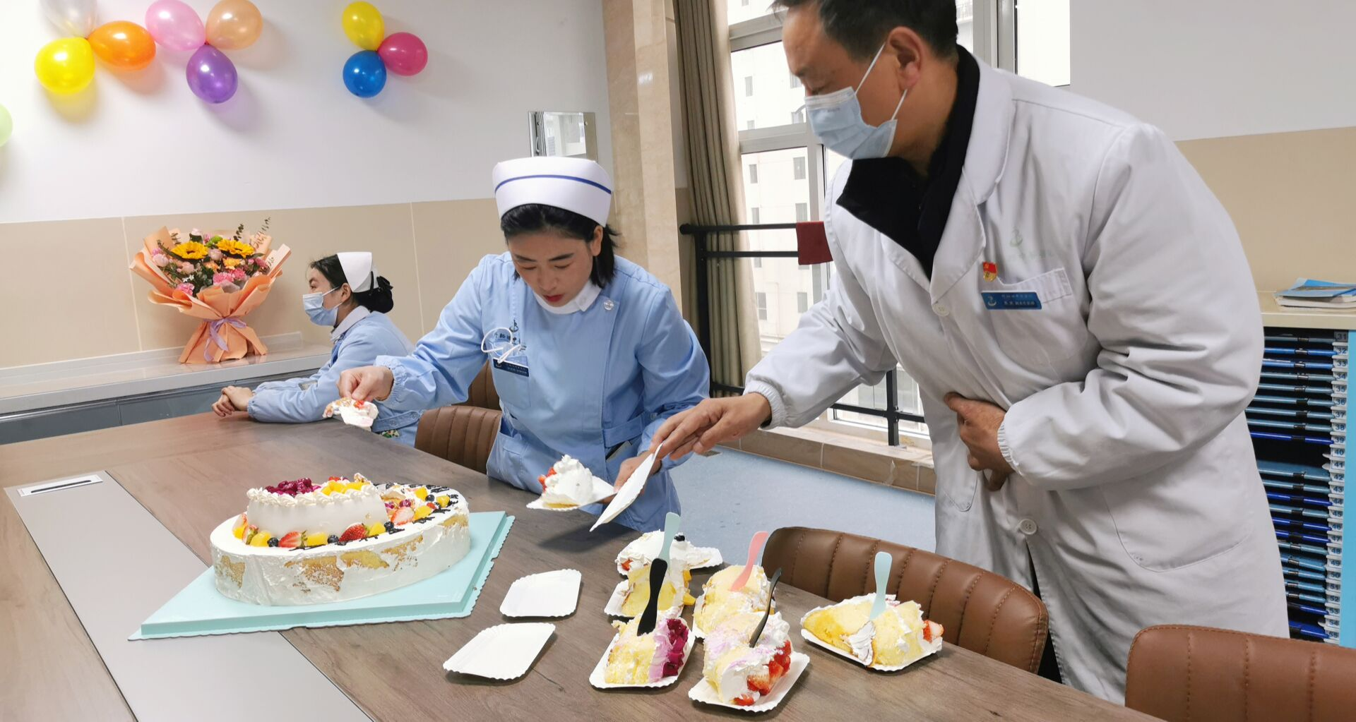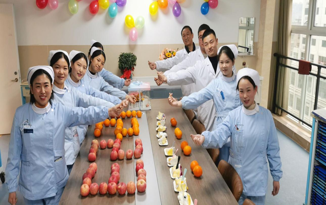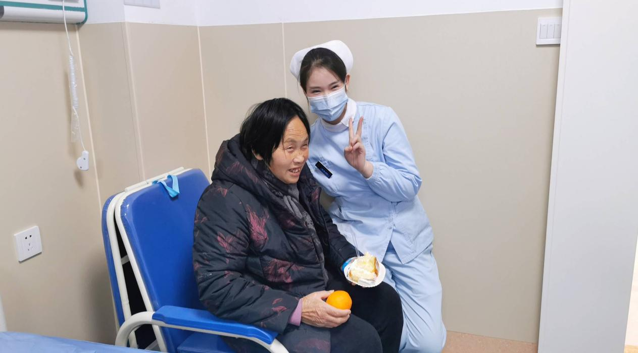 为了不耽误病人的治疗,转运到新病区后,大家又马不停蹄忙开了,输氧、输液、治疗,收治新病人,铺床等等。尽管大家身心疲惫,但此时此刻大家仍然拧成一股绳,不知疲倦的工作着。11点,病人转运结束后,医院领导热心的送来祝福,安慰激励我们每一位员工,让我们更有一股干劲。随着忙碌的工作,越发觉得时间过得很快了,不知不觉12点了,在我们科主任高岚及护士长王红艳精心策划下,我们为新的科室增添了一份新的仪式感,由我们美小护们为病人送去了蛋糕(代表幸福甜蜜),苹果(平平安安),橙子(称心如意),虽然是一份小小的心意,但看到病人脸上洋溢着幸福的笑容及声声道谢,我们开心备至。