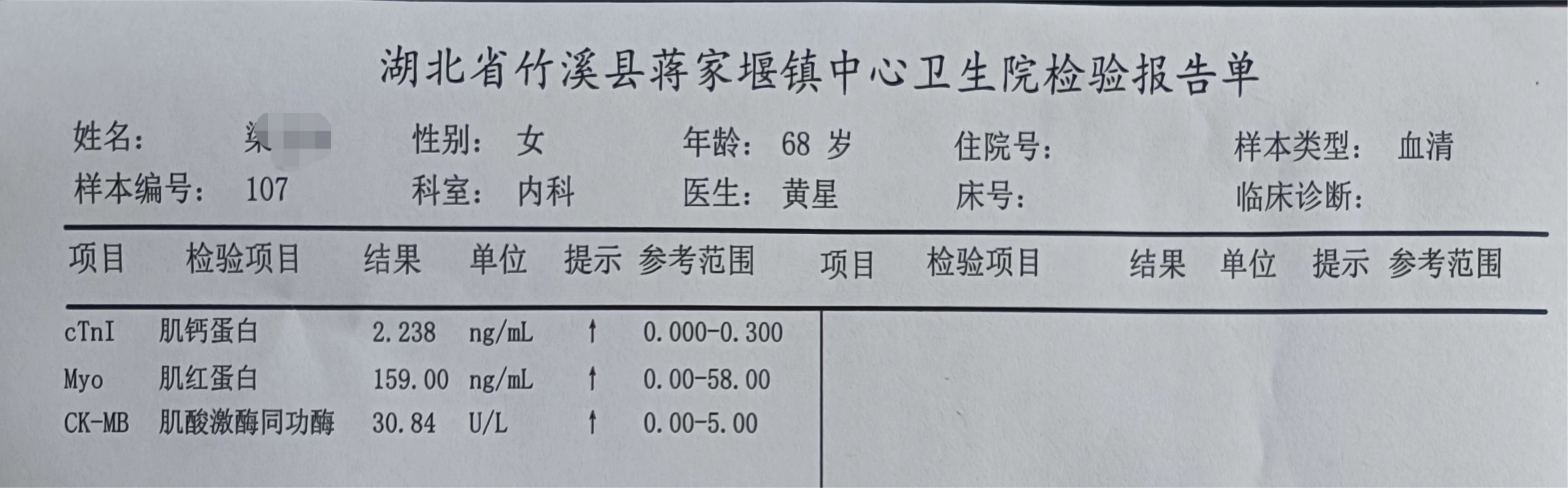 2022年6月8日 17时02分,患者梁某某,女,68岁,因“胸部不适2天”来到竹溪县蒋家堰镇中心卫生院就诊,首诊医师黄星询问病情后,考虑心源性胸痛,直接启动胸痛绿色通道,黄医生迅速检查患者的生命体征,询问患者病情,对病情做出判断,立即完善心电图检查(17时11分),依据心电图初步判断为急性广泛前壁心肌梗死,并上传至竹溪县心电网络平台,并在竹溪县心电网络中心交流微信群反馈,告知竹溪县中医院胸痛中心专家,请求复核结果,黄医生立即给予患者口服“心梗一包药”,告知患者及家属病情,并建议转诊至我县唯一具有介入下开通冠脉血管能力的中医院进行救治。17点20分值班护士立即完善心梗三项检查,17点38分,心梗三项结果提示肌钙蛋白,肌红蛋白,肌酸激酶均有不同程度的升高。此时,竹溪县中医院胸痛中心专家电话反馈心电图结果,结合患者症状、心梗三项结果,考虑该患者系急性心肌梗死,并告知我们该患者需急诊行心脏介入手术治疗,中医院介入团队已启动急诊介入导管室,并迅速派救护车赶来我院接转患者。