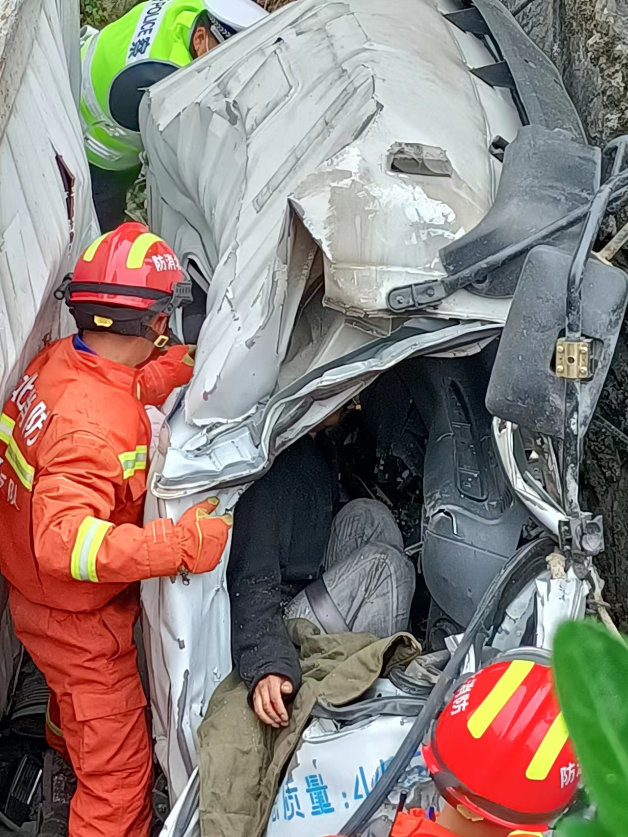 进一步了解情况,原来是外地车辆进南山片区送货因雨天道路湿滑、路况不熟导致侧翻坠崖,驾驶员和副驾驶两人受伤,驾驶员伤情较轻已被当地卫生院救出在送往我院途中,中途对接后发现受伤驾驶员满面血污呼吸费力胸痛明显,进行简单包扎固定后转往我院进一步处置。另一急救小组继续赶往现场执行急救任务,现场见副驾驶伤者因车头撞击变形被卡压不能动弹,急诊医生陈金文护士胡惠华现场为伤者建立静脉通道守护伤者安全,协助119破拆车头营救受伤副驾驶,经过40多分钟的破拆终于把卡压的副驾驶营救出来,检伤发现伤者呼吸困难、右上肢活动受限、全身多次擦伤,现场处置后火速转往医院进一步救治。