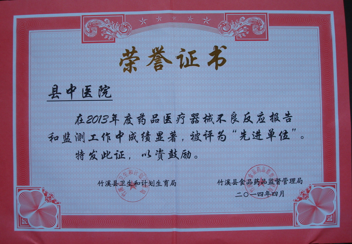 2014年4月28日,县中医院被县卫计局、县食品药品监督管理局评为2013年度药品医疗器械不良反应报告和监测工作先进单位。