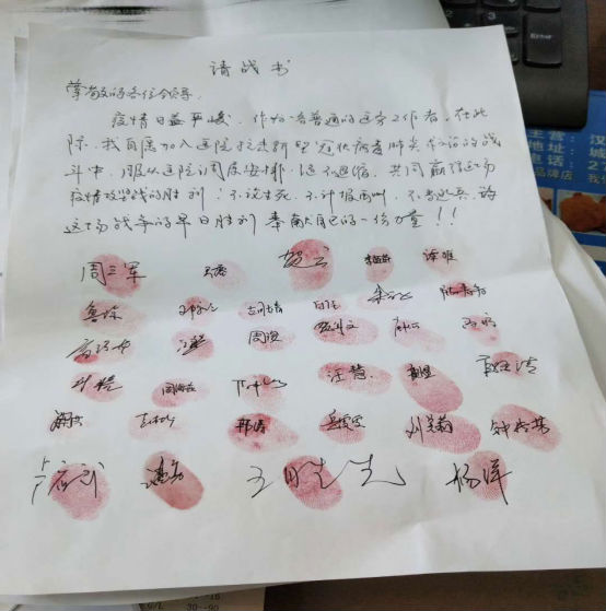 2月13号上午,四个梯队的所有医护人员全部到位,尤其是心内科周主任带领的第二梯队,他们自发的无一例外的在请战书上按下了自己的手印,看着那鲜红色的手印表露出了他们31位医护人员的心声,他们“不论生死、不计报酬、不当逃兵”,为战胜新型冠状病毒性肺炎贡献自己的一份力量”。